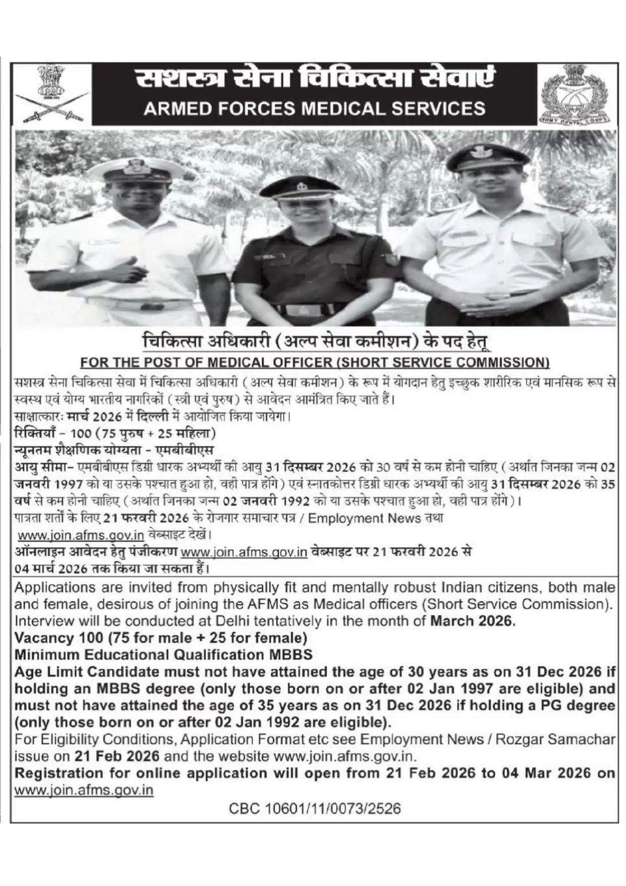 AFMS Medical Officer Recruitment 2026: क्या आप भी सशस्त्र सेना चिकित्सा सेवा (AFMS) में मेडिकल ऑफिसर (Short Service Commission) के पद पर सरकारी नौकरी प्राप्त करना चाहते है तो आपके लिए बड़ी अपडेट है कि, AFMS द्धारा मेडिकल ऑफिसर के रिक्त कुल 100 पदों पर भर्ती हेतु AFMS Medical Officer Recruitment 2026 को जारी कर दिया गया है जो कि, आपके लिए नौकरी पाने का बेहतरीन अवसर साबित हो सकता है।