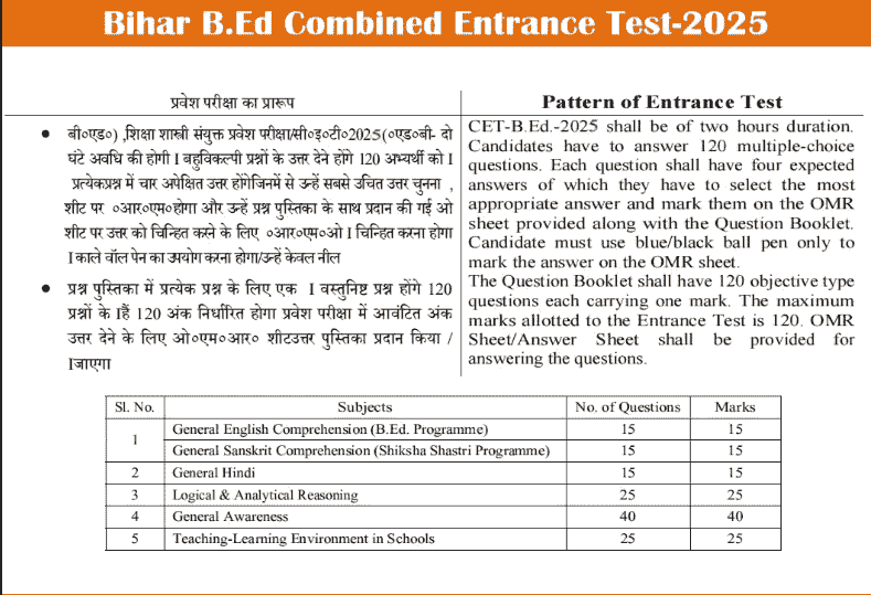 इस आर्टिकल मे हम, आपको Bihar B.ed CET Syllabus 2026 की जानकारी के साथ ही साथ Entrance Exam Pattern & Exam Profile की जानकारी प्रदान करेगें ताकि आप आसानी से पूरी जानकारी प्राप्त करके प्रवेश परीक्षा तैयारी करके अपार सफलता प्राप्त कर सकें और बी.एड कोर्स मे दाखिला प्राप्त कर सकें।