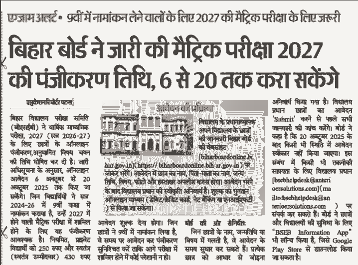 Download News Paper Cutting of Bihar Board Matric Registration 2027 | Download Now |