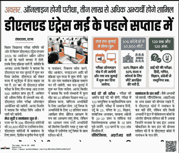 नहीं, लेकिन जल्द ही बिहार विद्यालय परीक्षा समिति, पटना द्धारा बिहार डीएलएड एडमिट कार्ड 2026 को जारी किया जाने वाला है जिसकी पूरी – पूरी जानकारी आपको लेख मे प्रदान करेगें।