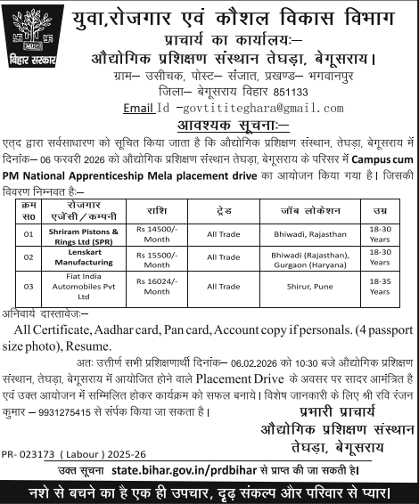 - अन्त मे, आपको सभी दस्तावेजों के साथ आगामी 06 फरवरी, 2026 के दिन ” औघोगिक प्रशिक्षण संस्थान तेघड़ा, बेगुसराय परिसर “ मे आना होगा और इस मेला मे हिस्सा लेना होग आदि।