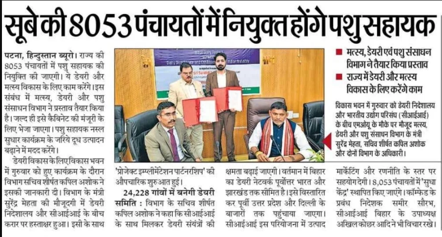 - बिहार की 8,053 पंचायतों में पशु सहायकों की नियुक्ति की जाएगी।