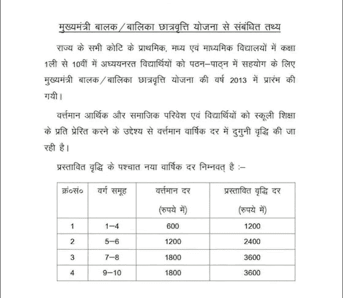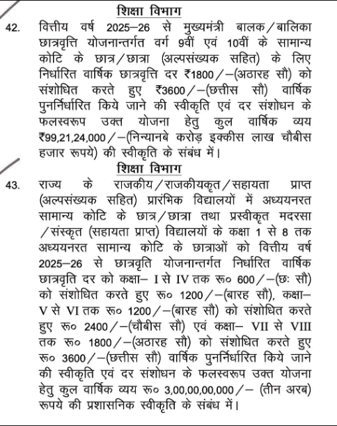 - बिहार सरकार द्धारा वित्तीय वर्ष 2025 – 2026 के तहत मुख्यमंत्री बालक / बालिका प्रोत्साहन योजना “ के तहत कक्षा 9वीं व 10वीं के सामान्य कोटि के सभी छात्र – छात्राओं ( अल्पसंख्यक सहित ) को बढ़ी हुई छात्रवृत्ति राशि के तहत अब प्रतिवर्ष पूरे ₹ 3,600 रुपयो की स्कॉलरशिप प्रदान करने का ऐलान किया गया है जिसके लिए बिहार सरकार द्धारा ₹99,21,24,000 रुपयो की स्वीकृति प्रदान की गई है ताकि सभी विद्यार्थियो का सतत शैक्षणिक विकास सुनिश्चित किया जा सकें।