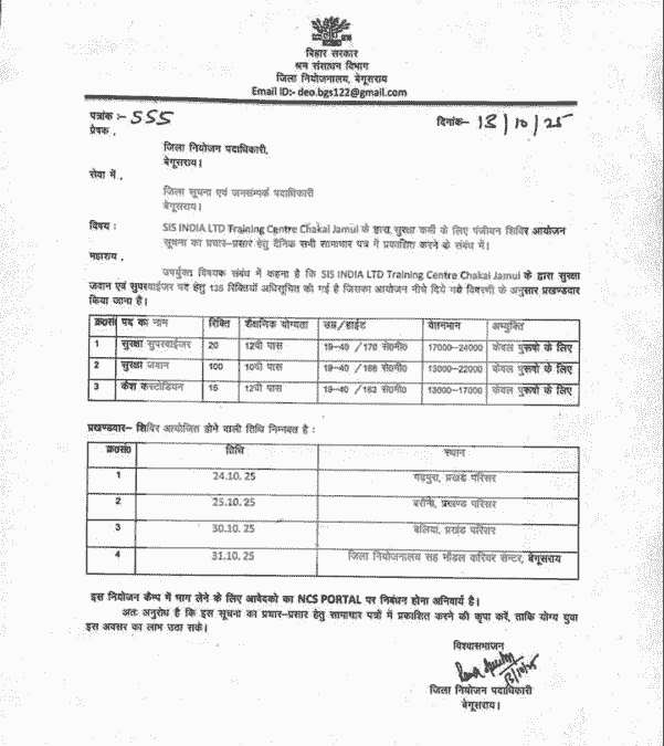 अपने इस आर्टिकल मे हम, आप सभी अभ्यर्थियों का हार्दिक स्वागत करना चाहते है जो कि, सिक्योरिटी गार्ड और सुपरवाईजर के पद पर नौकरी प्राप्त करके अपना करियर बूस्ट व ग्रो करना चाहते है वैसे सभी उम्मीदवारो के लिए जिला नियोजन पदाधिकारी, बेगूसराय द्धारा Bihar Security Guard & Supervisor Bharti 2025 को जारी किया गया है जिसकी पूरी जानकारी आपको लेख मे प्रदान करेगें।