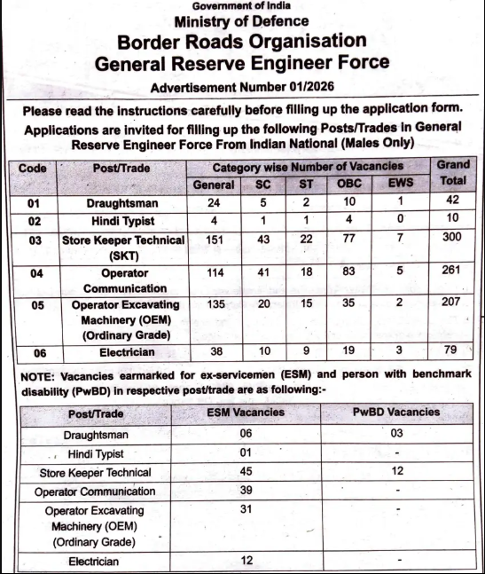 सभी उम्मीदवारो सहित आवेदको को बता दें कि, BRO 01/2026 Recruitment 2026 के तहत रिक्त कुल 899 पदों पर भर्तियां की जाएगी जिसके लिए योग्य आवेदक व उम्मीदवार आवेदन कर सकते है।
