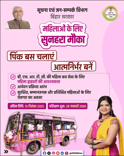BSRTC Pink Bus Driver Training 2025: यदि आप भी बिहार राज्य की रहने वाली महिला है जो कि, ना केवल बिलकुल फ्री मे ” पिंक बस “ चलाना सीखना चाहती है बल्कि पिंक बस चलाकर आत्मनिर्भर बनना चाहती है उनके लिए बिहार राज्य सड़क परिवहन निगम (BSRTC) ने ‘Bihar Pink Bus Driver Training 2025’ को शुरु कर दिया गया है जिसका लाभ आप सभी प्राप्त कर सकें इसके लिए हम, आपको विस्तार से BSRTC Pink Bus Driver Training 2025 की जानकारी प्रदान करेगें।