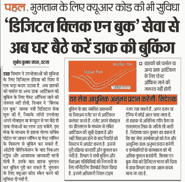 उत्तर – सभी पाठको सहित युवाओं को बता दें कि, India Post Self Service Portal पर आम जनता की सुविधा के लिए ” डिजिटल क्लिक इन बुक ” सुविधा को लांच किया है जिसकी मदद से अब आम नागरिक आसानी से पोर्टल पर घर बैठे डाक की बुकिंग कर सकते है।