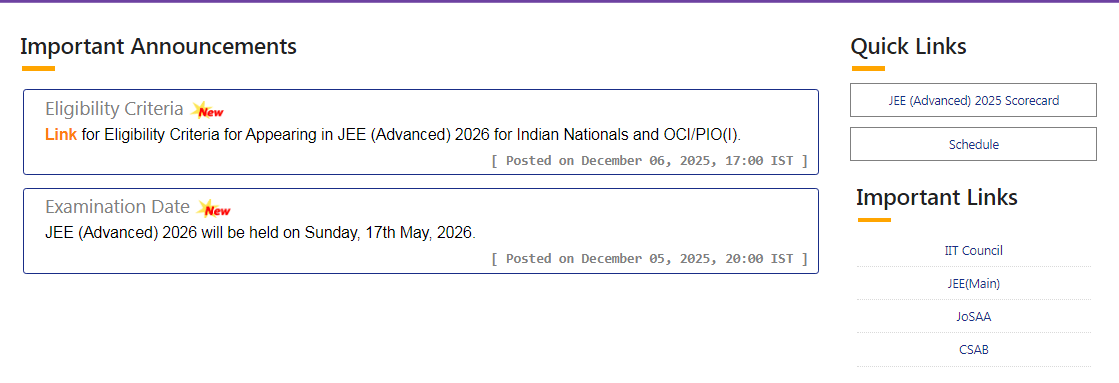 - JEE Advanced 2026 Exam Date को चेक व डाउनलोड करने के लिए सभी स्टूडेंट्स को सबसे पहले इसके Official Website के होम – पेज पर आना होगा जो कि, इस प्रकार का होगा –