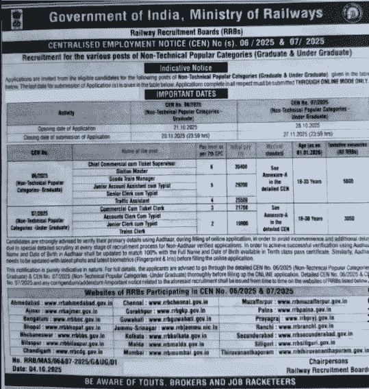 3000+ पदों पर आरआबी एनटीपीसी अंडर ग्रेजुऐट लेवल 2025 का नोटिफिकेशन जारी, जाने आवेदन प्रक्रिया, चयन प्रक्रिया और अन्तिम तिथि – Railway RRB NTPC Undergraduate Level (CEN 07/2025) Recruitment 2025?